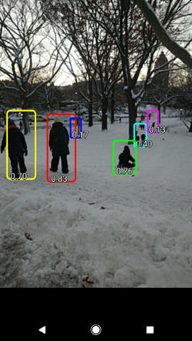 - TF Detect: Demonstrates an SSD-Mobilenet model trained using the Tensorflow Object Detection API introduced in Speed/accuracy trade-offs for modern convolutional object detectors to localize and track objects (from 80 categories) in the camera preview in real-time.